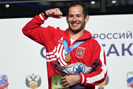 Sergey Bida celebrates after winning the men's individual foil final bout against Vadim Anokhin during the fencing event of the All-Russian Spartakiad of summer sports among professional athletes at the Irina Viner-Usmanova Gymnastics Palace in Moscow, Russia.24.08.2022#8259669