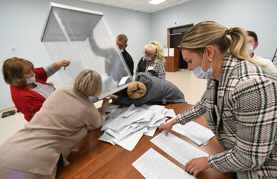 Election commission members count ballots at a polling station after the three-day by-elections of members of local governing bodies in St. Petersburg, Russia. Elections at various levels, dubbed the single voting day, are taking place in 81 regions throughout the country from September 9 to 11.11.09.2022#8272752