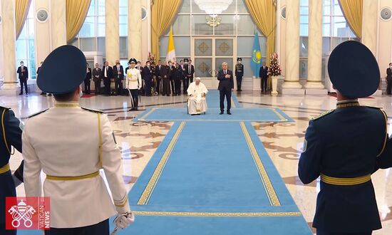 In this handout video grab released by the Holy See Press Office, Pope Francis and Kazakh President Kassym-Jomart Tokayev attend a welcoming ceremony at the Presidential Palace in Nur-Sultan, Kazakhstan. Pope Francis arrived on September 13 in Kazakhstan's capital for a three-day visit to take part in the 7th Congress of Leaders of World and Traditional Religions. Editorial use only, no archive, no commercial use.13.09.2022#8273565