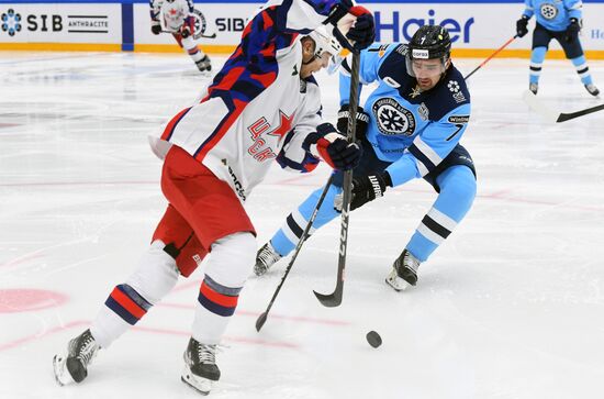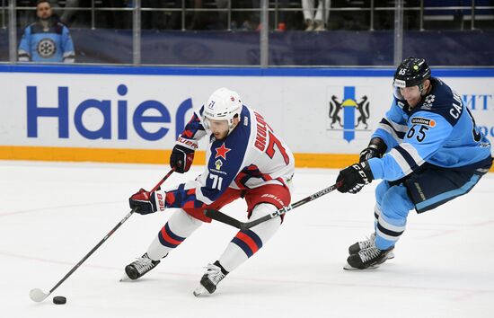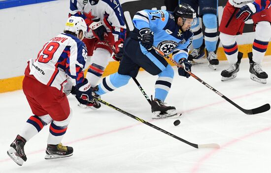 Sibir's Trevor Murthy and CSKA's Vitaly Abramov struggle for the puck during the Kontinental Hockey League ice hockey match between Sibir Novosibirsk region and CSKA Moscow, in Novosibirsk, Russia.06.10.2022#8290594