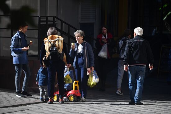 People walk down the street in Melitopol, Zaporizhzhia region territory, that has accessed Russia.04.10.2022#8294046
