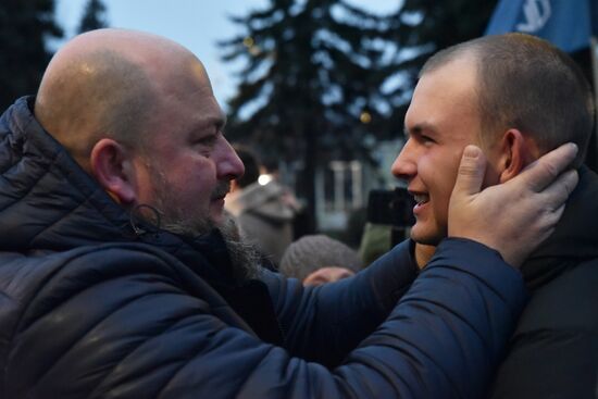 Service members of pro-Russian forces, who were exchanged during a prisoners of war (POWs) swap between Ukraine and Russia, meet their relatives upon the arrival, as Russia's military operation in Ukraine continues, in the town of Khartsyzsk, Donetsk People's Republic, Russia.26.11.2022#8325106