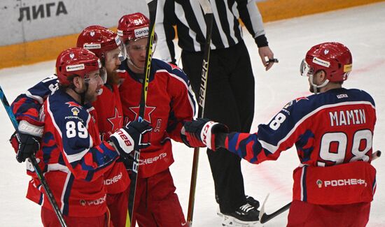 CSKA's players celebrate a goal during the Kontinental Hockey League ice hockey match between CSKA Moscow and Barys Astana, in Moscow, Russia.05.02.2023#8365575