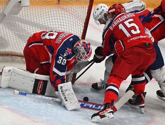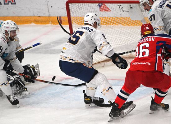 From left, CSKA's Vladislav Kamenev, Barys' Dmitry Shevchenko and Barys' goalie Julius Hudacek are seen during the Kontinental Hockey League ice hockey match between CSKA Moscow and Barys Astana, in Moscow, Russia.05.02.2023#8365569