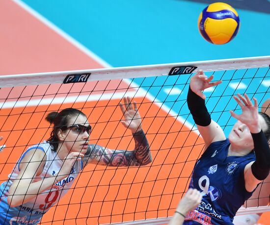 Dinamo-Ak Bars' Angelina Lazarenko, right, blocks the ball from Dynamo's Ekaterina Enina during the Super League women volleyball semi final match between Dinamo-Ak Bars Kazan and Dynamo Moscow, in Kazan, Russia's Republic of Tatarstan.12.02.2023#8369848