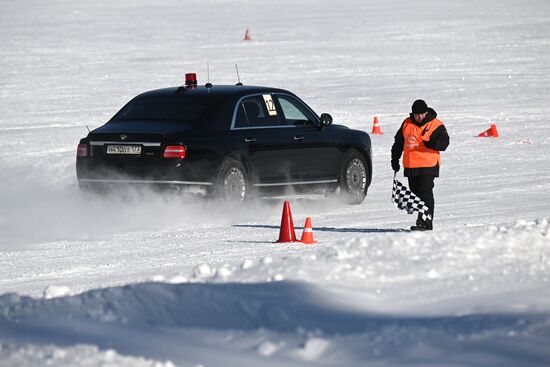 Cars are seen at the start line during a high-speed maneuvering competition held by the Special Purpose Garage (GON) of the Russian Federal Guard Service (FSO) in Moscow region, Russia.23.02.2023#8376357