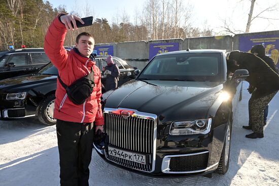 Visitors look an Aurus car before a high-speed maneuvering competition held by the Special Purpose Garage (GON) of the Russian Federal Guard Service (FSO) in Moscow region, Russia.23.02.2023#8376390