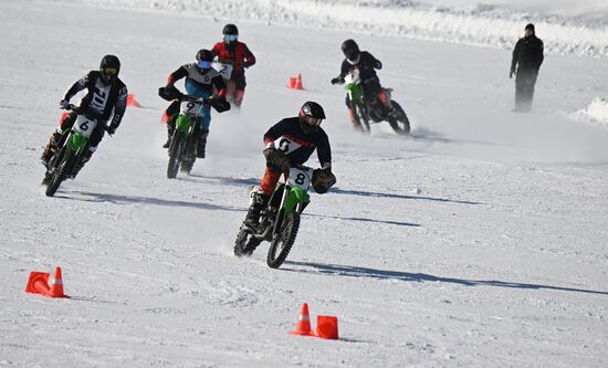 Participants drive motorcycles during a high-speed maneuvering competition held by the Special Purpose Garage (GON) of the Russian Federal Guard Service (FSO) in Moscow region, Russia.23.02.2023#8376450