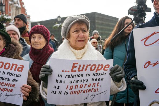 People take part in a rally against the decision of Committee on Monuments of the Riga City Council to dismantle the monument to Russian poet Alexander Pushkin, organized by the Latvian Russian Union political party in central Riga, Latvia.12.03.2023#8389051