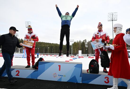 Athletes attend the awarding ceremony for the men's 50 km mass start classic event of the Russian Cross-Country Skiing Championship outside Tyumen, Russia.26.03.2023#8399030
