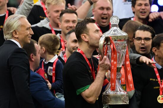 CSKA's goalkeeper Igor Akinfeev attends the awarding ceremony after the Russian Cup soccer super final match between CSKA Moscow and Krasnodar, in Moscow, Russia.11.06.2023#8453462