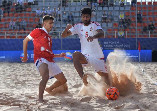 Russia's Andrei Kotenev and UAE's Ali Mohammad struggle for the ball during the Beach Soccer Nations Cup match between Russia and the United Arab Emirates, in St.Petersburg, Russia.21.07.2023#8482527