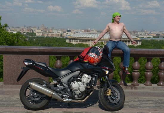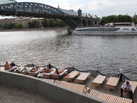 Muscovites tanning on Pushkin embankment in Moscow. Temperature in Moscow breaks current record and hits 28,7 degrees Celsius on May 14, 2013.14.05.2013#1468265