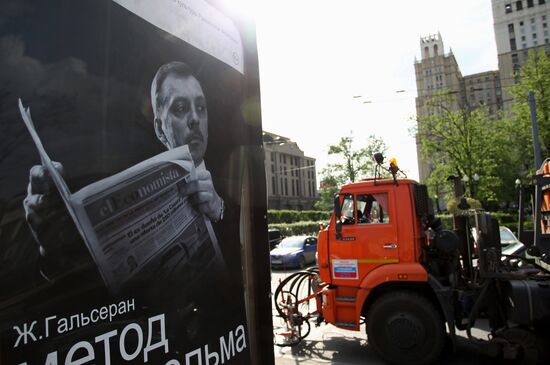 A street watering truck on Moscow's Garden Ring. Communal services have started heavy watering of city roads due to abnormally warm weather in Moscow.14.05.2013#1468263