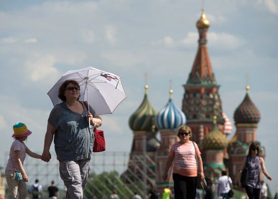 A woman seen with a child on the Red Square. Temperature in Moscow breaks current record and hits 28,7 degrees Celsius on May 14, 2013.14.05.2013#1468275