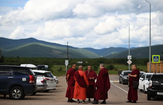 A man speaks to a Buddist monk in the settlement of Turka, the Republic of Buryatia, Russia.18.08.2023#8498130