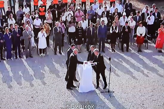 Kyrgyz President Sadyr Japarov appears on a screen via a video link as he attends a ceremony to launch the construction of three Russian-language secondary schools in Kyrgyzstan with the participation Russian President Vladimir Putin, in Solnechnogorsk, Moscow region, Russia.01.09.2023#8507339
