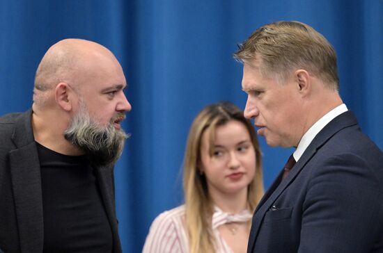 Head of Moscow's Kommunarka Multipurpose Clinical Centre, Denis Protsenko and Health Minister Mikhail Murashko talk before a meeting of the United Russia party's programme commission held by Deputy head of Russia's Security Council and chairman of the United Russia political party, Dmitry Medvedev, in Moscow, Russia.10.10.2023#8533817