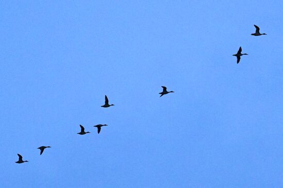 Ducks fly in the sky over Chany lake in Barabinsky district of Novosibirsk region, Russia.15.10.2023#8537126
