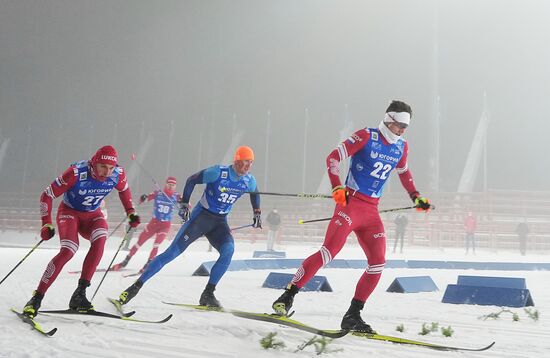 Ilya Tregubov, left, and Andrei Melnichenko, second left, compete during the men's sprint in the "Yugoria. First Snow" cross-country skiing competition in Khanty-Mansiysk, Russia.10.11.2023#8554344
