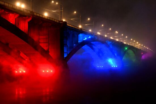 The Kommunalny Bridge over the Yenisei River is illuminated for New Year's Eve with festive lights while the air temperature is -33°C, in Krasnoyarsk, Russia.19.12.2023#8585580