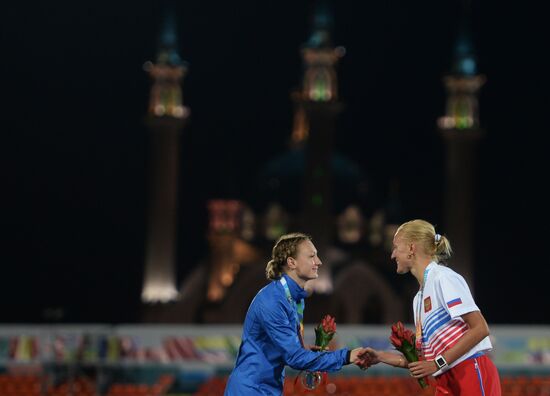 Medalists in the women’s 3000m steeplechase at the 27th World University Summer Games in Kazan, during the medal ceremony, from left: Ukraine’s Svitlana Shmidt (silver), Russia’s Yulia Zaripova (gold).10.07.2013#2230859