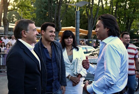Aras Agalarov, president, JSC Crocus International, left, his wife Irina and his son Emin Agalarov, vice president, Crocus Group, second left, and Alexander Rumyantsev, general director, New Wave Contest, right, during the third day of the New Wave Contest 2013 in Jurmala.27.07.2013#2254474