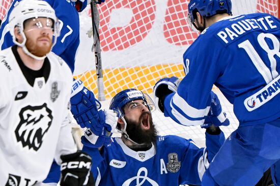 Dynamo's Dmitry Rashevsky celebrates the team's goal during the Kontinental Hockey League ice hockey match between Dynamo Moscow and Traktor Chelyabinsk in Moscow, Russia.18.03.2024#8644647