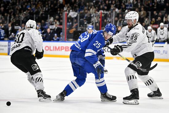 Dynamo Msk's Artyom Ilyenko, Traktor's Ilya Nikolaev and Dynamo's Yegor Rimashevsky struggle for a puck during the Kontinental Hockey League ice hockey match between Dynamo Moscow and Traktor Chelyabinsk in Moscow, Russia.18.03.2024#8644628