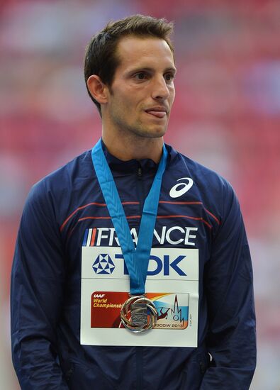 Renaud Lavillenie (France), winner of the silver medal in the men's pole vault at the 2013 IAAF World Championships in Moscow, during the medal ceremony.13.08.2013#2263446
