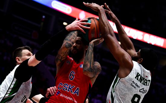 CSKA's Nikita Kurbanov, Semen Antonov and UNICS's Eric Green struggle for the ball during the VTB United League basketball final match between CSKA Moscow and UNICS Kazan, in Moscow, Russia.02.06.2024#8696671