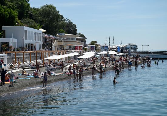 People enjoy a sunny day on a beach, in the Black Sea resort of Sochi, Russia. The resort opened 170 beach areas for the summer season.03.06.2024#8697482