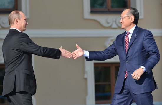 Russian President Vladimir Putin, left, and President of the World Bank Jim Yong Kim during an official welcome of G20 heads of state and government, heads of invited states and international organizations.05.09.2013#2278350