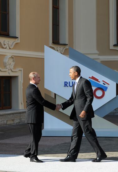 Russian President Vladimir Putin, left, and President of the United States of America Barack Obama during an official welcome ceremony in Strelna for G20 heads of state and government, heads of invited states and international organizations.05.09.2013#2278425