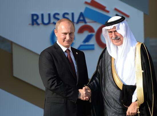 Russian President Vladimir Putin, left, and Ibrahim bin Abdulaziz Al-Assaf, Minister of Finance of Saudi Arabia, during an official welcome of G20 heads of state and government, heads of invited states and international organizations.05.09.2013#2278354
