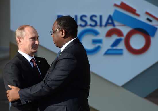 Russian President Vladimir Putin, left, and President of Senegal Macky Sal, a representative of the New Partnership for Africa's Development (NEPAD), during an official welcome of G20 heads of state and government, heads of invited states and international organizations.05.09.2013#2278461