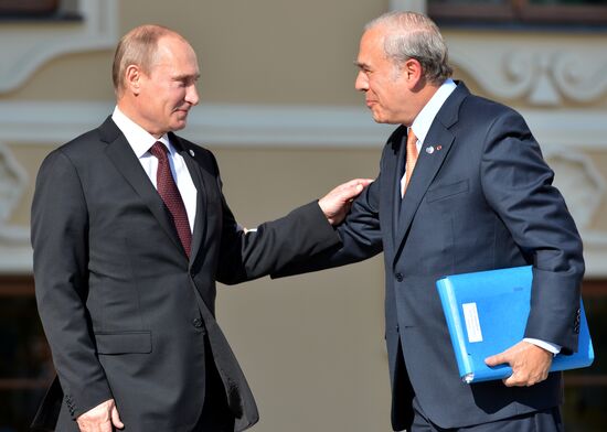 Russian President Vladimir Putin (left) and Secretary-General of the Organisation for Economic Co-operation and Development Jose Angel Gurria during the official welcome of heads of delegations of G20 member states, invited countries and international organizations05.09.2013#2278469
