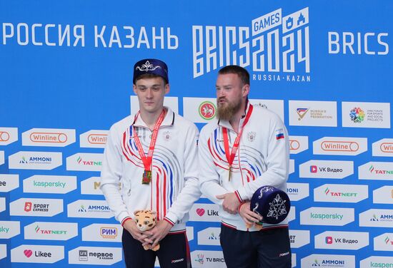 Gold medallist Evgenii Kuznetsov and Nikita Shleikher of Russia pose on the podium during the medal ceremony for the men's synchronized 3 m springboard diving event of the 2024 BRICS Sports Games at Aquatics Palace in Kazan, Republic of Tatarstan, Russia.18.06.2024#8710371