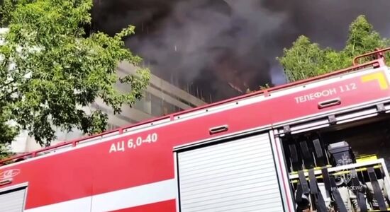 In this handout video grab released by the Russian Emergencies Ministry, firefighters work to extinguish a fire at Platan Scientific Research Institute in Fryazino, Moscow Region, Russia. Editorial use only, no archive, no commercial use.24.06.2024#8715568