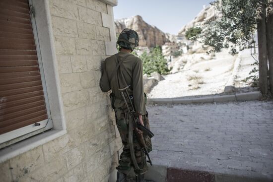 A government soldier runs across the street where there is still shooting in Maaloula.13.09.2013#2283807