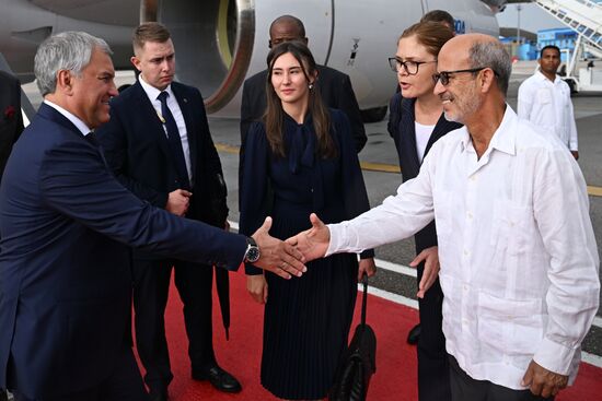 Russian State Duma Speaker Vyacheslav Volodin, second left, is welcomed by officials upon arrival at at Jose Marti International Airport, in Havana, Cuba.21.07.2024#8732362