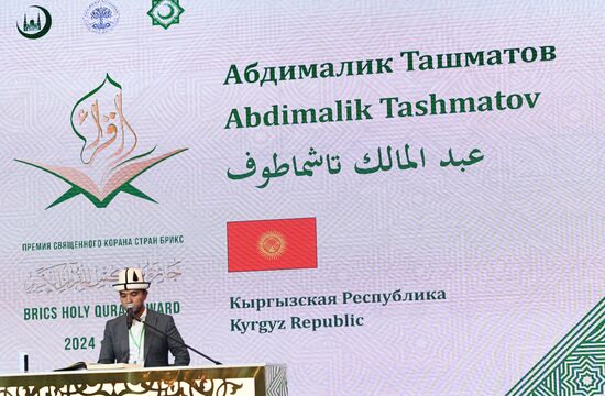 Hafiz Abdimalik Tashmatov of Kyrgyzstan speaks during the BRICS Holy Quran Award in Kazan, Republic of Tatarstan, Russia. From July 24 to 26, 2024, the strongest Quran reciters from BRICS member states, the Arab-Muslim world, Africa, and the CIS will compete in the category of "Tilawah" (skillful recitation of the Holy Quran).24.07.2024#8733440