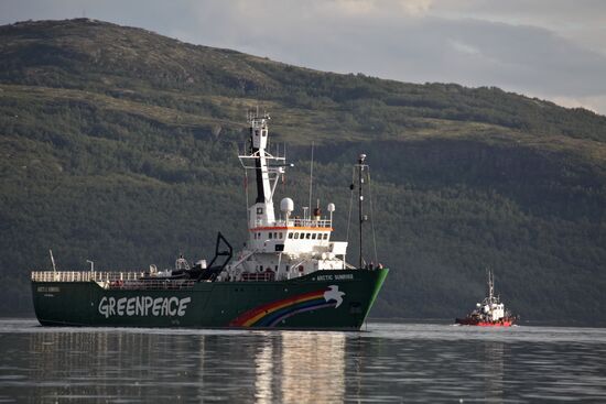 Greenpeace ship Arctic Sunrise in Kola Bay in the Murmansk port. The Russian coast guard seized Greenpeace activists after an incident that occurred in the Pechora Sea near the Prirazlomnaya platform owned by Gazprom. The ship Arctic Sunrise is being towed into the Murmansk port by Russian coast guard officers.03.08.2012#2287842