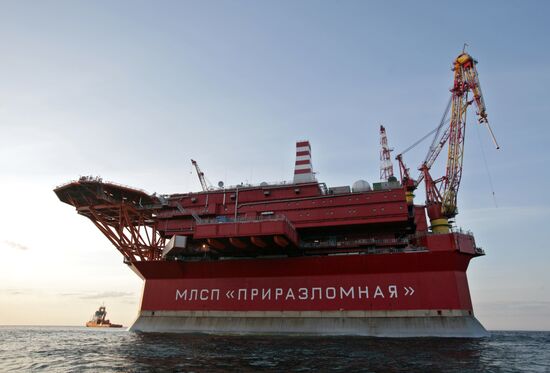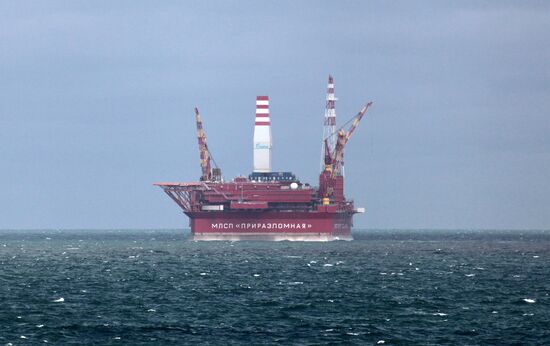 The Prirazlomnaya oil rig in the Barents Sea (archive photo of 25.08.2012). The frontier guard of Federal Security Service have detained Greenpeace activists near Gazprom's oil rig. The Russian border guards escort the Arctic Sunrise ship to a port in Murmansk.25.08.2012#2287875
