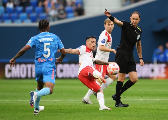 Referee Vitaliy Meshkov, left, and Spartak's Nail Umyarov argue during the Russian Premier-League soccer match between Zenit St. Petersburg and Spartak Moscow, in St. Petersburg, Russia.24.08.2024#8749242