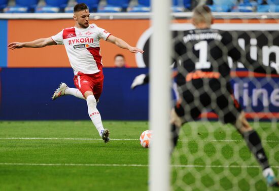 Spartak's Oleg Reabciuk shoots as Zenit's goalkeeper Evgeni Latyshonok defends his goal during the Russian Premier-League soccer match between Zenit St. Petersburg and Spartak Moscow, in St. Petersburg, Russia.24.08.2024#8749239