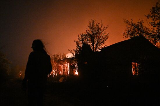A local resident walks in a street during a fire in the village of Stepnoe in the Antratsitovsky municipal district of the Lugansk People's Republic, Russia.14.09.2024#8765695