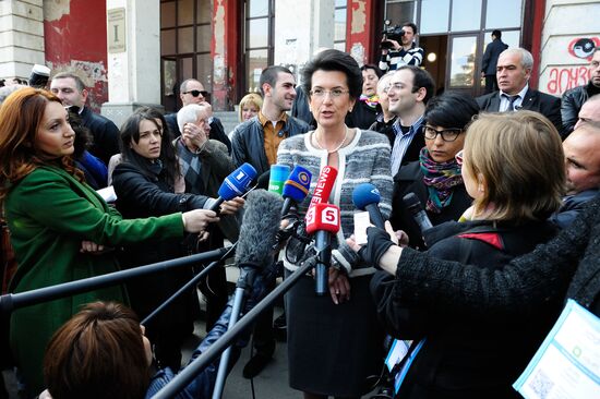 Nino Burdzhanadze, center, presidential candidate from the Democratic Movement-United Georgia party, speaks to journalists after casting her vote at a polling station in Tbilisi.27.10.2013#2308868