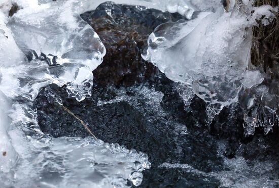 A stream runs beneath thawed holes on the ice surface of the Mokhovy Creek of the Takmakovsky rocky district during a late autumn day in the Stolby National Park, located 10 km south of Krasnoyarsk, Russia. The Takmakovsky District of the Krasnoyarsk Stolby National Park is the closest to the city and one of the most popular places for outdoor activities in the Krasnoyarsk Territory.21.11.2024#8809766