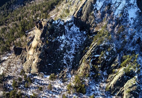 A landscape view shows the syenite cliffs named Bolshoi Berkut and Takmak, right, of the Takmak rock massif during a late autumn day in the Stolby National Park, located 10 km south of Krasnoyarsk, Russia. The Takmakovsky District of the Krasnoyarsk Stolby National Park is the closest to the city and one of the most popular places for outdoor activities in the Krasnoyarsk Territory.21.11.2024#8809757